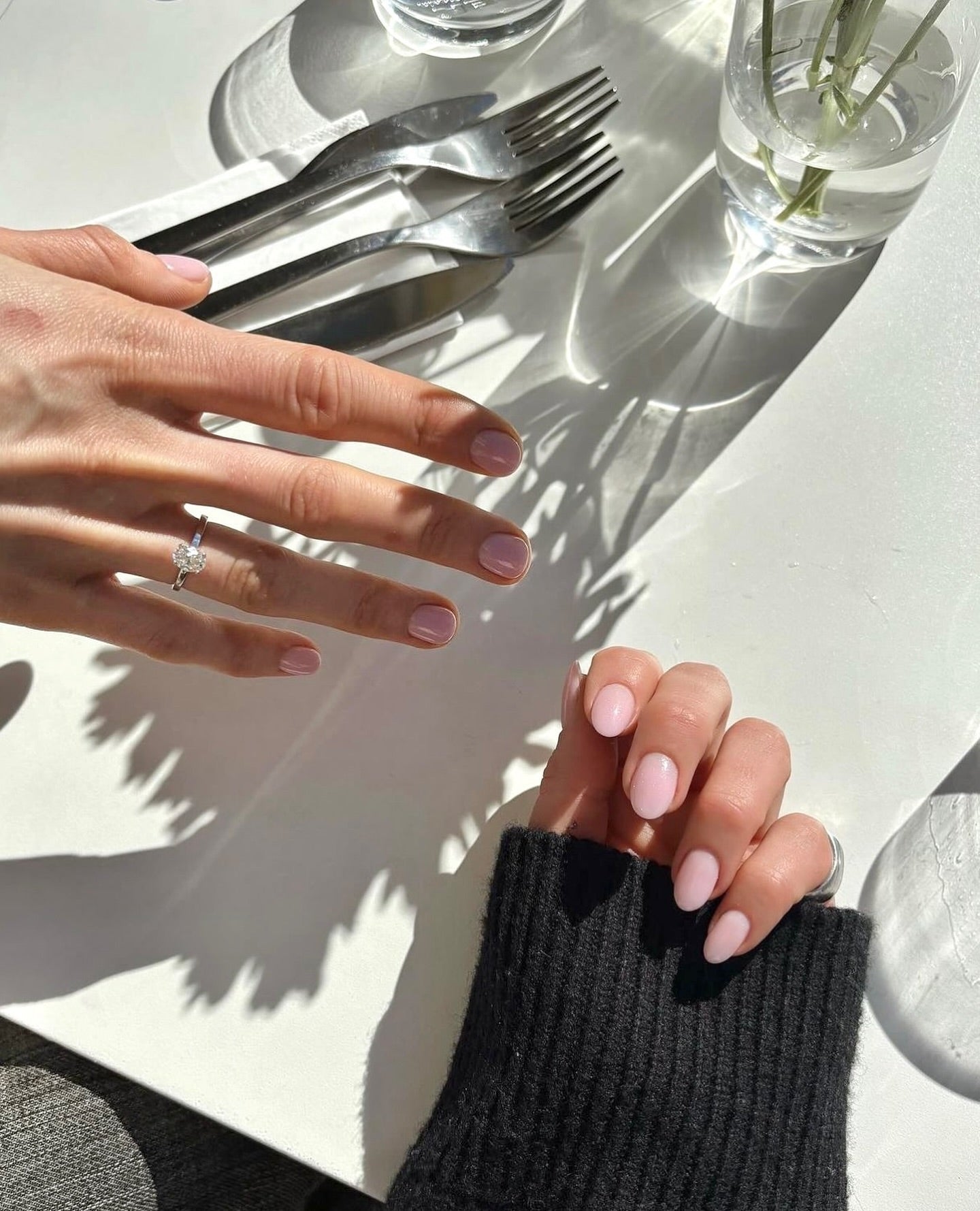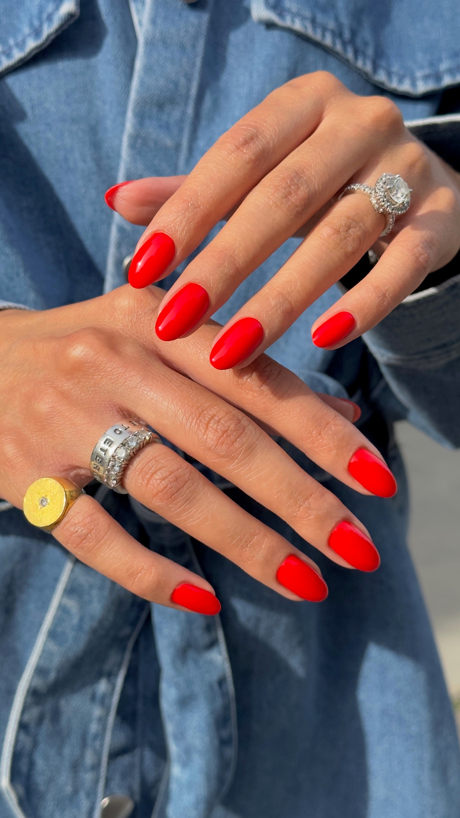 Nail shaping and buffing, precise single coloured nail polish/structured gel polish application, cuticle oil, hand lotion.
